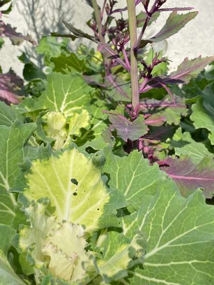 下の方を見てみると、キャベツみたいなのがあります。キャベツの変種のようなもので、葉牡丹という植物です。冬にホームセンターや園芸店などでよく見かけます。