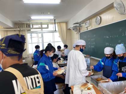 一人一人がお盆を持って給食当番から配膳してもらいます。