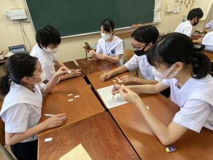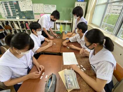 それぞれが持っている情報カードを伝え合って、学校の配置図を完成させていきます。