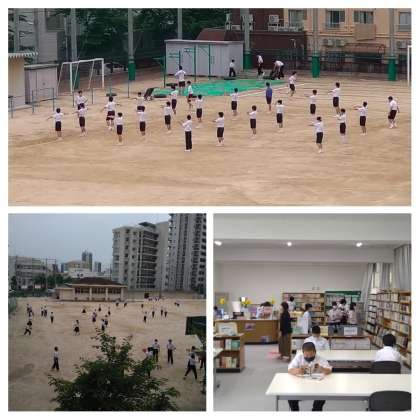 下の写真は、昼休み時間の運動場と図書室の様子です。
