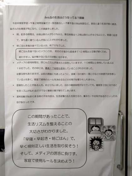 本日、全校朝礼で調査の結果、生活習慣が乱れてきたことの報告がありました。「『早寝・早起き・朝ごはん』で早く規則正しい生活を取り戻そう!」と声かけがありました。