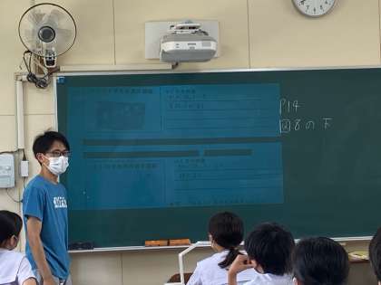 生徒の観察結果を書画カメラで投影しながら、説明しています。