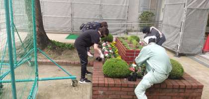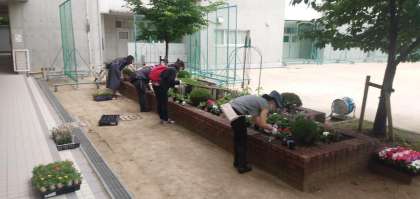 本日、PTA緑化活動を感染症対策をとりながら少人数で活動しました。天気が微妙でしたが管理作業員さんの下準備もあり、活動ができました。1年の理科の教員も参加してます。
