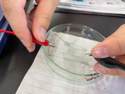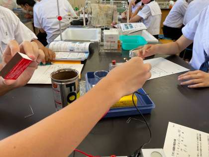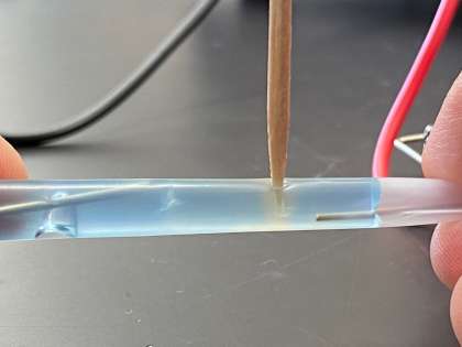 後半では、BTB溶液を添加した寒天を使って、電気泳動の実験もしました。