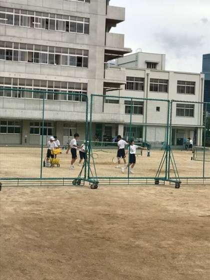 グラウンドでは男子テニス部、体育館では男女バスケットボール部が活動しています。