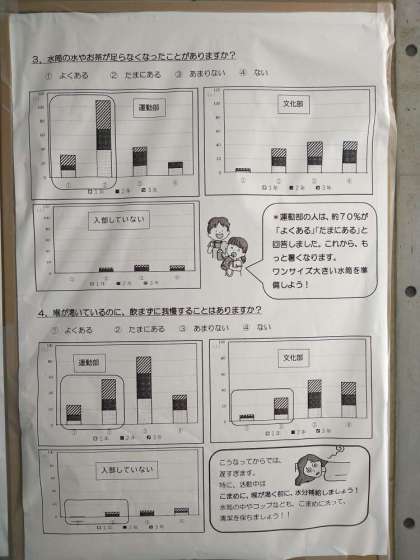 保健室の前に大きな模造紙に書かれた保健委員会よりの『水分調査アンケート』の結果を新聞にまとめてくれました。