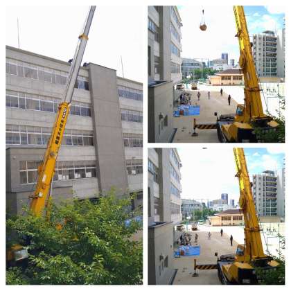 また、特別教室の室外機の取り付け工事(屋上)のため、クレーン車による作業も行われました。安全対策のため、運動場の一部を閉鎖しました。
