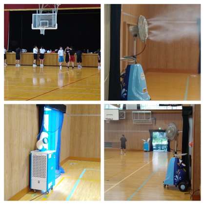 体育館には、ミスト扇風機・スポットクーラーも準備され、また給水タイムも適切に設定されており、熱中症には十分に配慮されています(一番下の写真)。