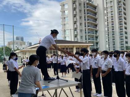本日、全校集会で夏休み中に開催された大会の表彰伝達を行いました。