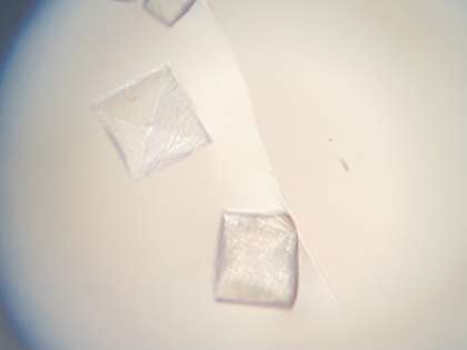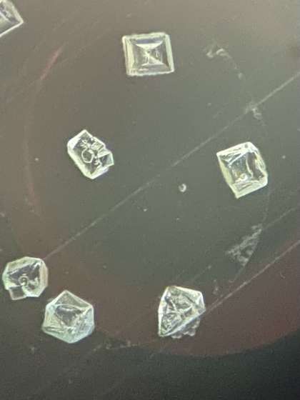 中和によって生成した塩を顕微鏡観察してみると、教科書通りの完全な立方体の他に、いろいろな形の結晶が見られました。