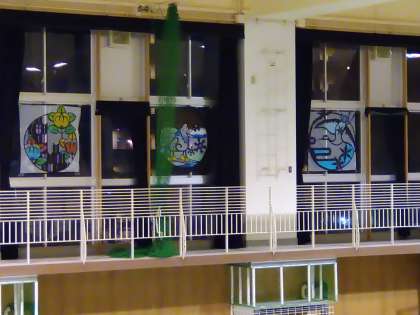 お庭には『灯籠』が、玄関には『あつまれ ほくりょうの森』が、ピロティの大型TVモニターには『体育大会の映像』が流れています。