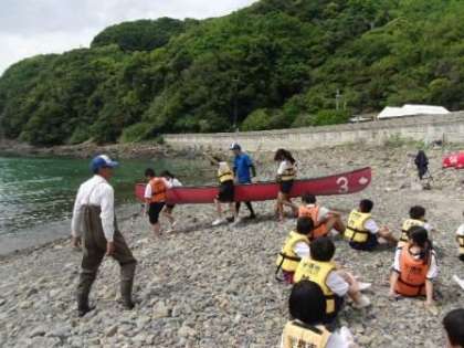 カヌーを波打ち際まで運び、インストラクターさんの説明を聞きます。