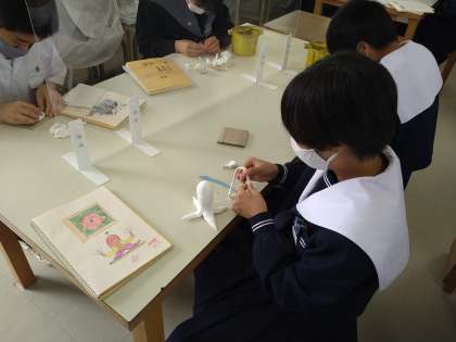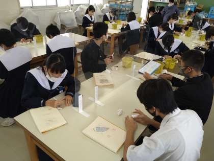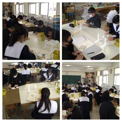 生徒たちは、一生懸命に作品づくりに取り組んでいました。互いに向き合っての座席ですが、アクリルパーティションが設置され感染対策は万全です。