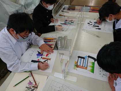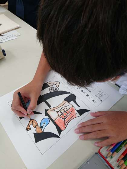絵文字を制作しています。丁寧にレタリングした点画の一部を、漢字の意味に合ったイラストを組み合わせて表現します。なかなか楽しい作品に仕上がってきました。