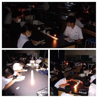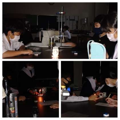 写真は、ろうそく・凸レンズ・スクリーンを使っての実験の様子です。