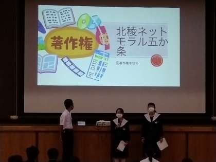 今朝の2年生の学年朝礼では、情報委員会より『北稜ネットモラル 5か条』の著作権のお話がありました。昨日の1年生とはまた違った映像を用いての情報委員より説明がありました。