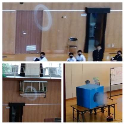 一番上の写真は、『大型空気砲』による演示実験です。みごとなまでに美しい煙の輪っかが、体育館の後方上方にまで飛んでいきました。