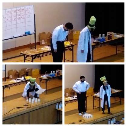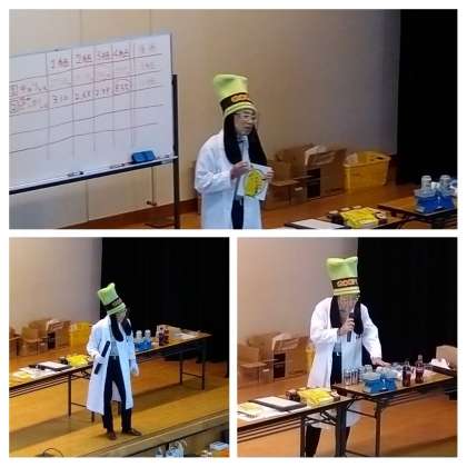 クラス対抗蓄電池レース後は、『実験大好きおじさん』が色々な実験を披露してくれました。