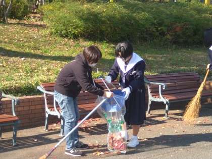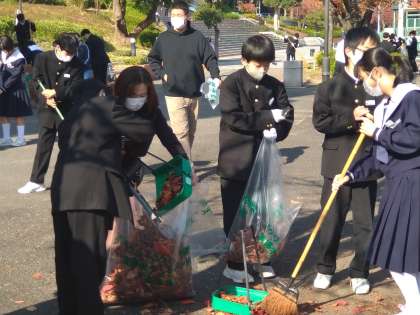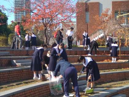 多くの保護者の皆さんにも参加していただき、紅葉がきれいな大川周辺の美化活動を行いました。
