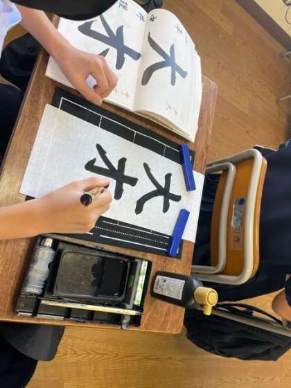 行書は中学校ではじめて学習しますが、生徒は手本を見ながら筆運びに気をつけて丁寧に書いていました。