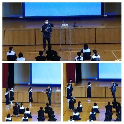 はじめに『学校体験活動1』で実習にきていた瀧本先生と松岡先生からご挨拶がありました。「来年度4月からは『学校体験活動2』で再度実習をさせていただきます」「よろしくお願いします」との内容のお挨拶でした(一番上の写真)。