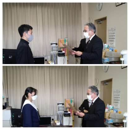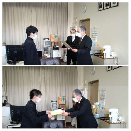 本日、14時から本校校長室で「税についての作文」の表彰式が行われました(コロナの関係で昨年度に続いて校長室が表彰式会場となりました)。