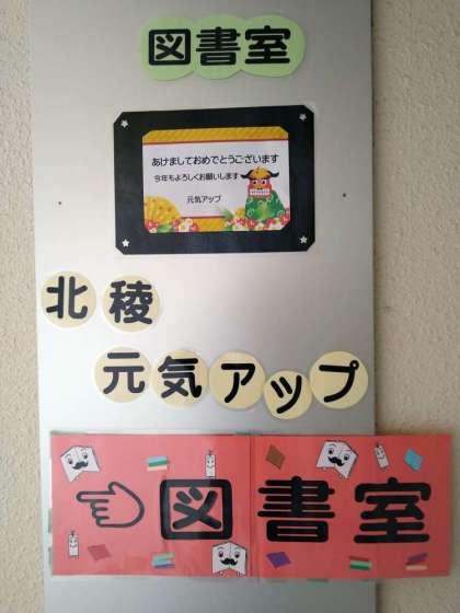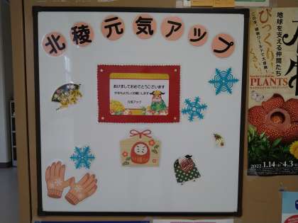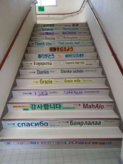 新年のご挨拶の掲示と、新しい階段アートが作成されていました(国際色豊かです)。