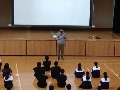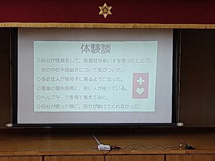 今朝は2年生の学年朝礼がありました。特別支援学級担当の先生から『共生社会』についてのお話がありました。