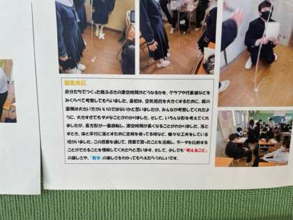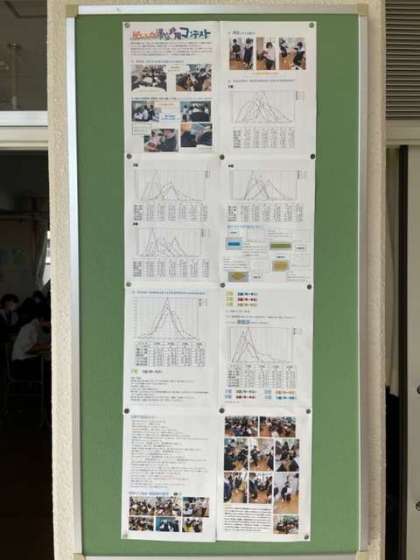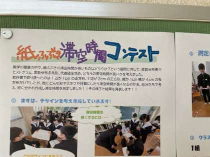 廊下の掲示板に貼り出されていたのは、「紙ふぶき滞空時間コンテスト」のまとめでした。