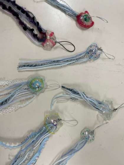 仮入部初日は、クラゲのアクセサリー製作をしました。先輩から優しく教えてもらい、とても上手に作っていました。