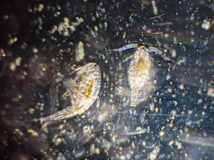 顕微鏡で池の水の中の小さな生物を観察しました。