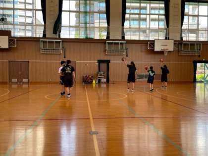 体育館では女バスが練習しています。