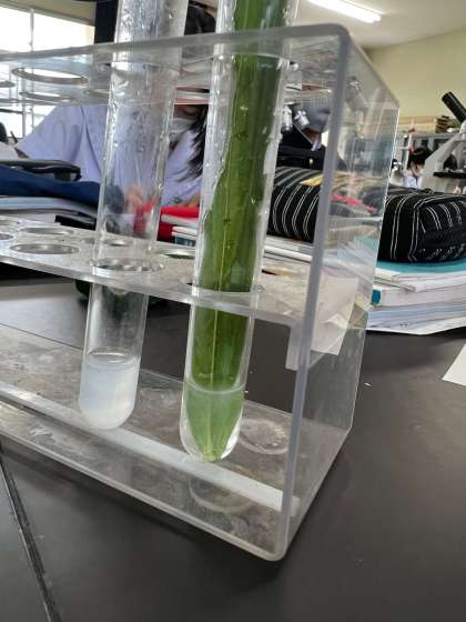 結果、元々の二酸化炭素濃度が高すぎて、対照実験だけでなく、葉を入れた方も白く濁ってしまいました。