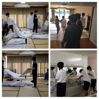 6時30分起床です!寝具を片付けたり、歯磨きしたり、先生方は全員の生徒の検温をしています。