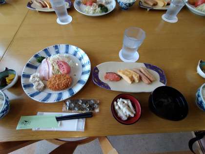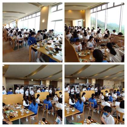 朝食もみんなモリモリ食べています。太陽も出てきました。「一日、晴れますように!」