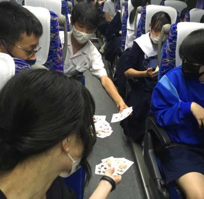 3組バス、ポーカーで盛り上がる生徒たちに、「1回だけ」と言って担任の先生も参戦。