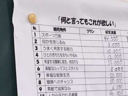才能や能力などのアイデンティティを競売形式で手に入れるという取り組みをしました。楽しみながら、もっと伸ばしたい能力や足りない才能など、自分について考える機会になりました。