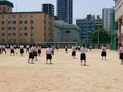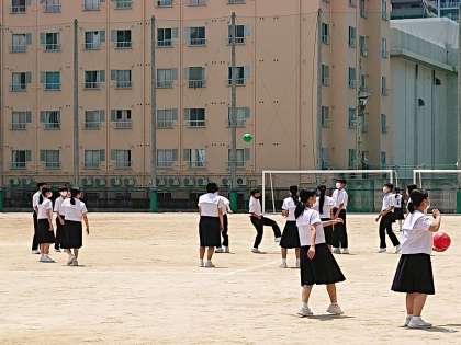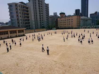 久々のお天気。運動場にはたくさんの生徒がバレーボールで遊んでいます。本当に楽しそうです。