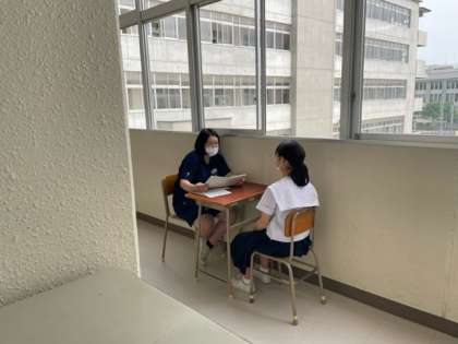 担任の先生は廊下にて教育相談をしています。