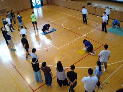 本日は、期末テストの終了後、午後から先生方を対象に、大阪市消防局北消防署員の方々を講師にお招きし『救命救急講習会』を開催しました。