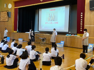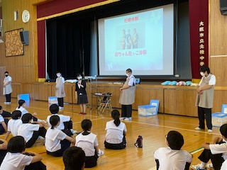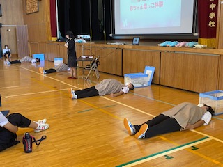 各クラス1名男子に妊婦を体験してもらいました。赤ちゃん、胎盤、羊水の重さで、約5キロをお腹につけて、靴下を脱いだり、寝転んだりといろいろ体験しました。お母さんの大変さが少しわかったようです。