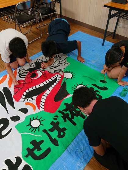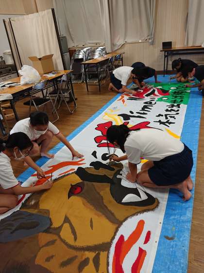 体育大会で飾る横断幕を生徒会と有志で制作しています。どんな横断幕に仕上がったかお楽しみに!