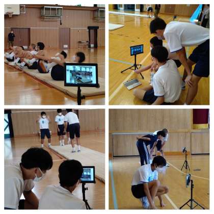 男子は、マット運動です。タブレットを活用しての授業でした。