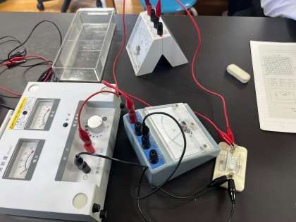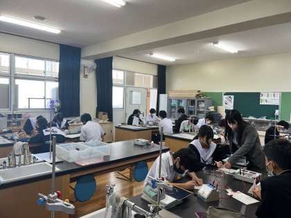 写真は4組での実験の様子です。必要最小限の説明の後、生徒たちが自分たちで回路を考え、実験を行っていました。実験のスキルが着実に向上しているようです。