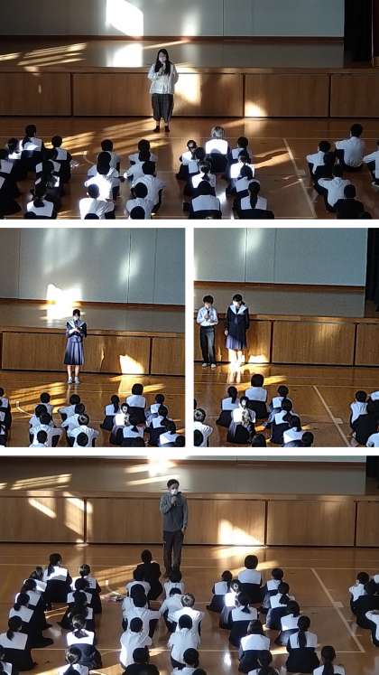 また、先日行われた文化祭の取組では、1年生の共同作品ある『モザイクアート』や『合唱コンクール』は、本当にすばらしく、皆さんの一生懸命に取り組む姿に刺激を受け、先生たちもさらに頑張れた。今は、皆さんとの良い信頼関係が築けていることをたいへん嬉しく思っているという内容のお話がありました。