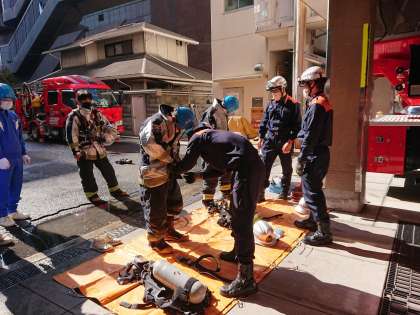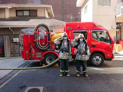 大阪市北消防署では、実際に使用されている防火服を着用し、酸素ボンベを背負い、6階の高さまで駆け上がる体験をしました。重たい防火服をきての階段ダッシュはかなり大変でしたが、見事最上階まで上がることができました。貴重な体験を沢山させていただきました。