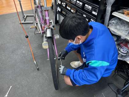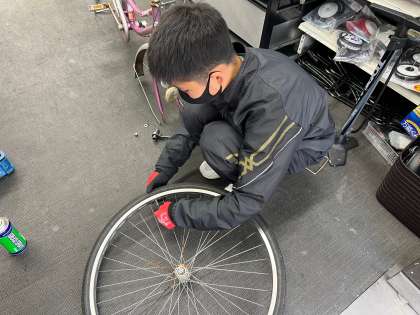 自転車のタイヤの外し方を教わっていました。自転車の整備についてもたくさん学ばせていただいたようです。