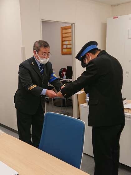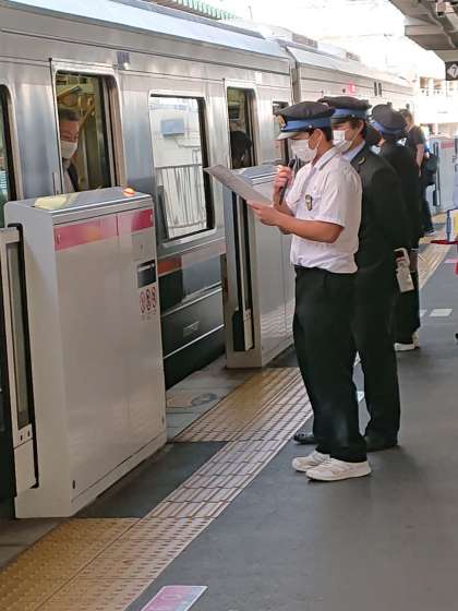 JR京橋駅では、ホームでの放送体験を、しました。駅員さんに指導してもらい、落ち着いてアナウンスできいました。