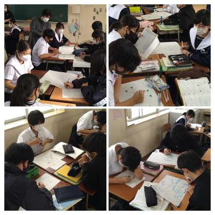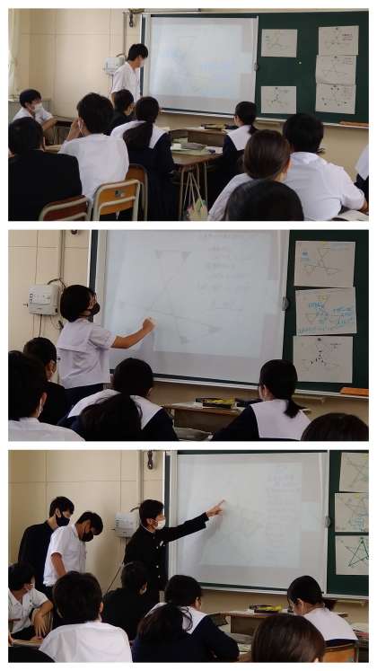 授業では、「いろいろな角度の和」をテーマに、対頂角や三角形の内角・外角の性質をつかって班で協力しながら難問に挑戦していました。