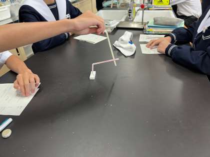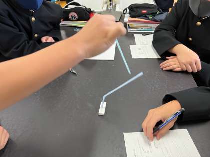 写真は、プラスチックストローを布でこすって、ストローどうしに働く力と、ストローと布の間で働く力について調べ、静電気の性質について考察しました。